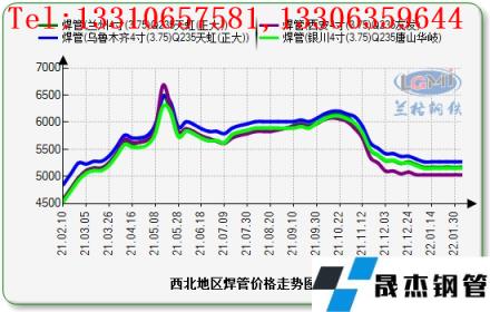 一月份(1.01-1.31),西北地區焊管鍍鋅管價格繼續下跌。雲商平台監測數據顯示,截至2022年1月31日,西安地區4寸(3.75mm)焊管價格為5000-5030元,與上月同期價格持平;蘭州地區4寸(3.75mm)焊管價格為5150-5170元,比上月同期價格下跌50元;銀川地區4寸(3.75mm)焊管價格為5130-5150元,比上月同期下跌50元;烏魯木齊地區4寸(3.75mm)焊管價格為5190-5270元,比上月同期下跌50元。西安地區4寸(3.75mm)鍍鋅管價格為5900-6070元,比上月同期價格下跌140-240元;蘭州地區4寸(3.75mm)鍍鋅管價格為5880-6000元,比上月同期價格下跌50元;銀川地區4寸(3.75mm)焊管價格為5940-6000元,比上月同期下跌50元;烏魯木齊地區4寸(3.75mm)焊管價格為6260-6280元,比上月同期上漲40元。