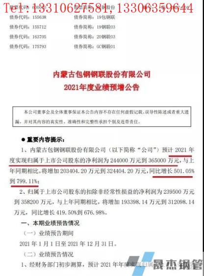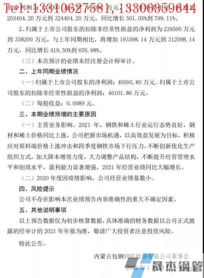 1月11日晚,鋼鐵板塊的牛股包鋼股份公布業績預告,預計2021年度實現歸屬於上市公司股東的淨利潤為24.4億元到36.5億元,與上年同期相比,將增加20.34億元到32.44億元,同比增長501.05%到799.11%;歸屬於上市公司股東的扣除非經常性損益的淨利潤為23.95億元到35.82億元,與上年同期相比,將增加19.34億元到31.21億元,同比增長419.50%到676.98%。