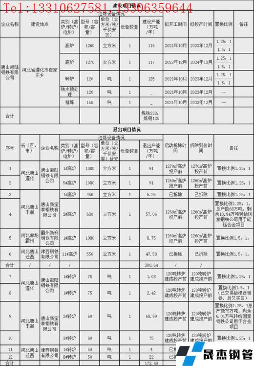 唐山港陸鋼鐵有限公司退出1080m³高爐2座、退出產能182萬噸;75t轉爐2座,退出產能3.5萬噸/年;唐山新寶泰鋼鐵有限公司450m³高爐1座,退出產能5.25萬噸/年;630m³高爐1座,退出產能57.06萬噸/年;60t轉爐2座,退出產能143.99萬噸/年;霸州新利鋼鐵有限公司1080m³高爐1座,退出產能8.75萬噸/年;津西鋼鐵有限公司退出550m³高爐1座,退出產能47.58萬噸/年;50t轉爐2座,退出產能26萬噸/年。共計退出煉鐵產能300.64萬噸,煉鋼產能173.49萬噸,所有項目將於新建項目建成投產前拆除。