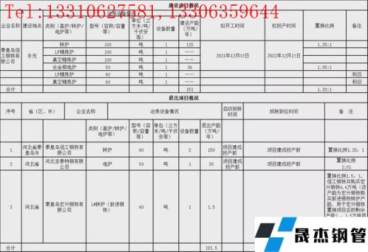 秦皇島佰工鋼鐵有限公司退出60t轉爐2座,產能150萬噸/年;河北吉泰特鋼有限公司退出50t電爐1座,產能30萬噸/年;秦皇島宏興鋼鐵有限公司退出60t轉爐1座,產能1.5萬噸/年。共計退出煉鋼產能181.5萬噸,所有項目將於新建項目建成投產前拆除。