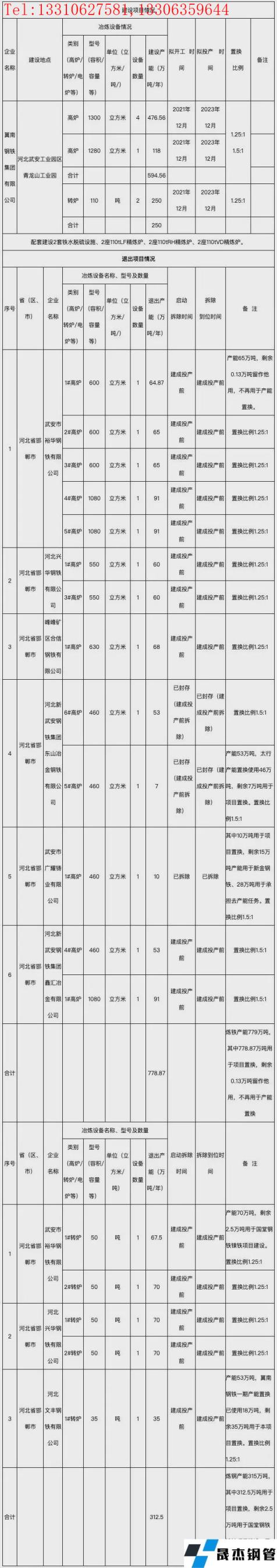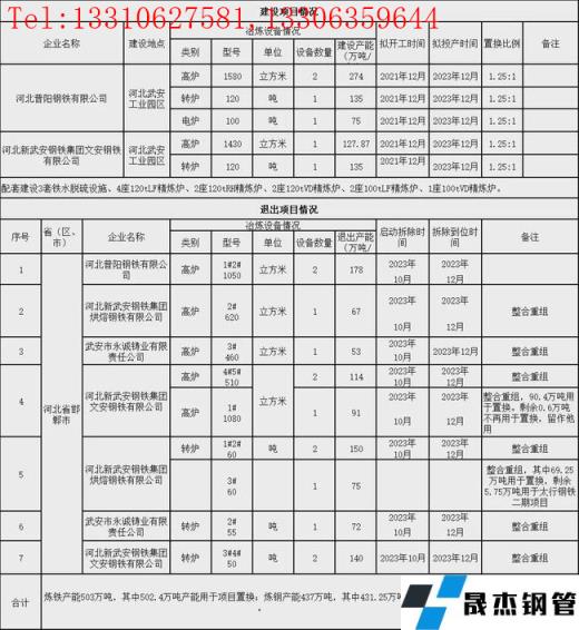河北普陽鋼鐵有限公司退出高爐1050m³高爐2座,退出產能178萬噸/年。河北新武安鋼鐵集團烘熔鋼鐵有限公司退出620m³高爐1座,退出產能67萬噸/年;退出60t轉爐3座,產能225萬噸/年。武安市永誠鑄業有限責任公司退出460m³高爐1座,退出產能53萬噸/年;退出55t轉爐1座,產能72萬噸/年。河北新武安鋼鐵集團文安鋼鐵有限公司退出510m³高爐2座,退出產能114萬噸/年;退出1080m³高爐1座,退出產能91萬噸/年;退出50t轉爐2座,產能140萬噸/每年。共計退出煉鐵產能503萬噸,其中502.4萬噸產能用於項目置換;退出煉鋼產能437萬噸,其中431.25萬噸產能用於項目置換,所有項目將於2023年10月前拆除。