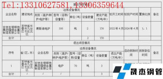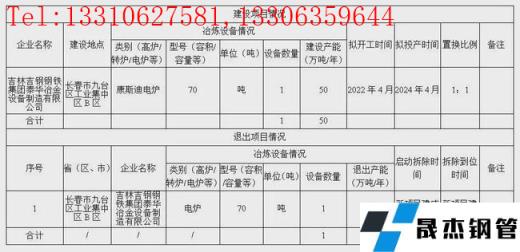 吉林吉鋼鋼鐵集團泰華冶金設備製造有限公司擬於2022年4月在長春市九台區工業集中區B區新建70t康斯迪電爐1座,產能50萬噸/年,項目預計2024年4月投產。同時計劃退出70t電爐1座,產能50萬噸/年,預計在新項目投產前拆除。