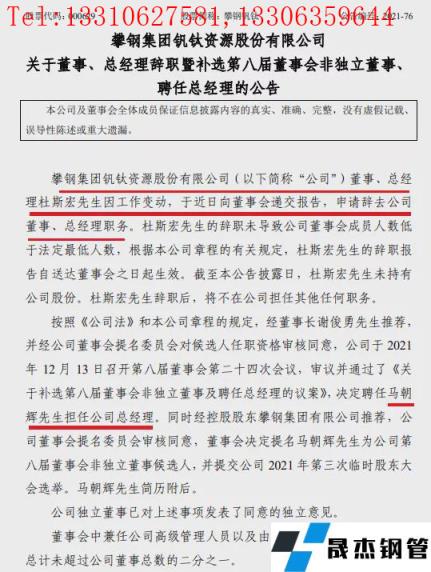 12月13日,攀鋼釩鈦董事會收到公司董事、總經理杜斯宏因工作變動,於近日向董事會遞交報告,申請辭去公司董事、總經理職務。杜斯宏的辭職未導致公司董事會成員人數低於法定最低人數,根據本公司章程的有關規定,杜斯宏的辭職報告自送達董事會之日起生效。截至本公告披露日,杜斯宏未持有公司股份。杜斯宏辭職後,將不在公司擔任其他任何職務。