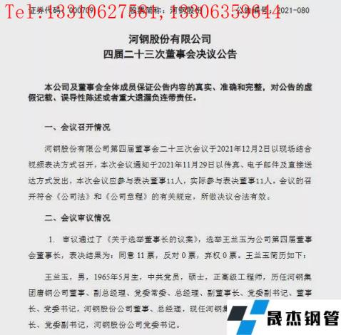 12月3日河鋼股份有限公司(以下簡稱河鋼股份)發布了第四屆二十三次董事會決議公告,據該公告顯示,河鋼股份第四屆董事會二十三次會議於2021年12月2日以現場結合視頻表決方式召開,會議審議並通過了《關於選舉董事長的議案》,選舉王蘭玉為公司第四屆董事會董事長。
