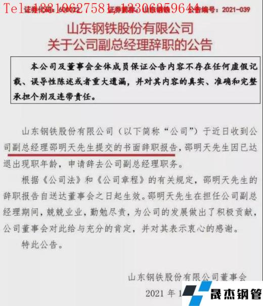 12月1日,山東鋼鐵發布公告稱,於近日收到公司副總經理邵明天先生提交的書麵辭職報告。邵明天先生因已達退出現職年齡,申請辭去公司副總經理職務。