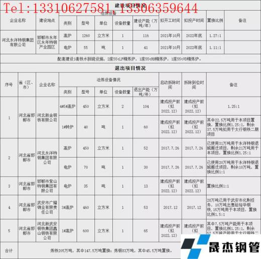 河北新金鋼鐵有限公司退出450m³高爐2座,產能104萬噸/年;40t轉爐1座,產能60萬噸/年。河北永洋特鋼集團有限公司退出450m³高爐1座,產能52萬噸/年;70t電爐1座,產能30萬噸/年。邯鄲市紫山特鋼集團有限公司退出35t電爐1座,產能13萬噸/年。武安市廣耀鑄業有限責任公司退出460m³高爐1座,產能53萬噸/年。河北新武安鋼鐵集團鑫山鋼鐵有限公司退出600m³高爐1座,產能65萬噸/年。