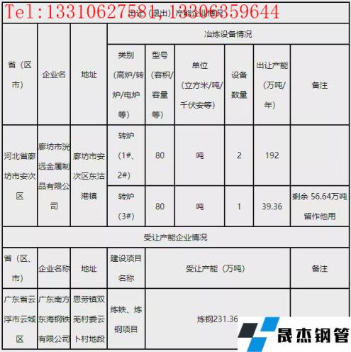 1月12日,河北工信廳發布變更廊坊市洸遠金屬製品有限公司部分產能出讓方案。方案表明,廊坊市洸遠金屬製品有限公司擬出讓80t轉爐3座給廣東南方東海鋼鐵有限公司,共計出讓煉鋼產能231.36萬噸,剩餘56.64萬噸留作他用。