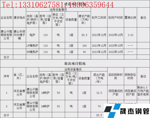 1月12日,河北工信廳發布唐山興隆鋼鐵有限公司煉鋼產能等量置換轉型升級項目產能置換方案。方案表明,唐山興隆鋼鐵有限公司擬於2021年12月在唐山市灤州市榛子鎮新建110t電爐1座,產能82.5萬噸/年;110tLF精煉爐2座,產能160萬噸/年;110tVD精煉爐1座,產能90萬噸/年。所有項目預計2022年10月投產。同時退出50t轉爐2座,產能82.5萬噸/年,並於項目建成投產前拆除。