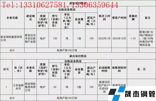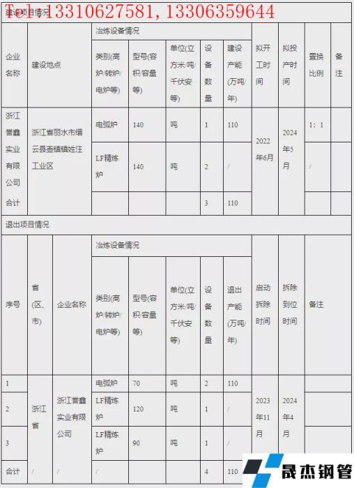 2022年1月7日,浙江省經信廳發布浙江譽鑫實業技術改造升級建設項目產能置換方案。方案顯示,浙江譽鑫實業有限公司擬於2022年6月新建140t電弧爐1座和140tLF精煉爐2座,產能110萬噸/年,項目預計2024年5月投產。同時退出70t電弧爐2座、120tLF精煉爐1座和90tLF精煉爐1座,共計退出產能110噸。項目於2023年11月啟動拆除,並於2024年4月拆除到位。