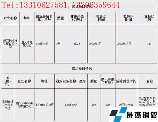 2022年1月4日,遵義市工業和能源局發布遵義長嶺特殊鋼有限公司產能置換方案,方案公示期為2022年1月4日至2022年1月29日。方案顯示,遵義長嶺特殊鋼有限公司擬於2022年3月新建110t電爐1座,產能82.5萬噸/年,預計2023年12月投產。同時退出110t電爐1座,產能110萬噸/年,於項目投產前拆除。