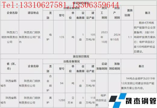 12月24日,陝西省工信廳發布陝西龍門鋼鐵建設項目產能置換調整方案。方案表明,陝西龍門鋼鐵擬於2023年10月在現場區內新建135t電爐1座,產能105萬噸/年,預計2024年10月投產。同時計劃退出94t合金轉爐1座,產能109萬噸/年;1280m³高爐1座,產能118萬噸/年,並於電爐項目投運前拆除到位。
