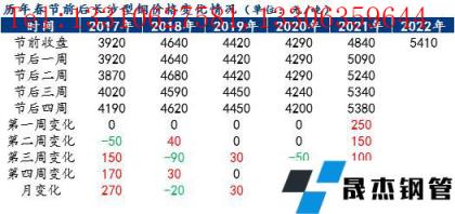 首先從近幾年春節前後長沙型鋼價格變化情況來看,除了2021年,其餘幾年節後第一周基本以穩為主,主要是因為需求未開始啟動,市場平盤運行。元宵之後,需求逐漸得到釋放,除了2020年因公共衛生事件影響,釋放進度有所滯後,節後開盤價格出現回落,其餘幾年以震蕩趨強運行為主,不管是無縫鋼管廠還是貿易商,為獲利消化冬儲庫存,均對節後開門紅存在一定期待。而2022年節前收盤價格偏高,貿易商情緒較為謹慎,正常備庫,主動冬儲意願不強,節後市場庫存壓力相對可控,對開盤價格存在一定支撐。