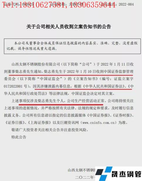 1月12日晚間,“不鏽鋼龍頭”太鋼不鏽發布公告稱,公司於2022年1月11日收到董事柴誌勇先生通知,柴誌勇先生於2022年1月10日收到中國證券監督管理委員會的《立案告知書》(編號:證監立案字0172022001號),因其涉嫌泄露內幕信息,根據相關法律法規,中國證監會決定對其立案。