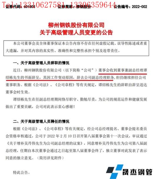 2月10日,柳州鋼鐵股份有限公司發布關於高級管理人員變更的公告。公告顯示,柳鋼股份董事會收到董事兼副總經理譚紹棟的書麵辭呈,其因工作變動原因,辭去柳鋼股份副總經理職務,但仍繼續擔任柳鋼股份董事職務。