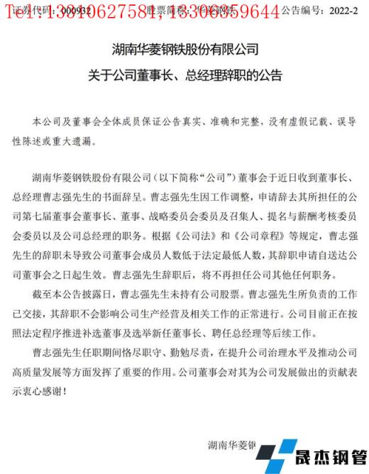 日前,湖南華菱鋼鐵股份有限公司發布公告稱,公司董事會於近日收到董事長、總經理曹誌強的書麵辭呈。曹誌強因工作調整,申請辭去其所擔任的公司第七屆董事會董事長、董事、戰略委員會委員及召集人、提名與薪酬考核委員會委員以及公司總經理的職務。