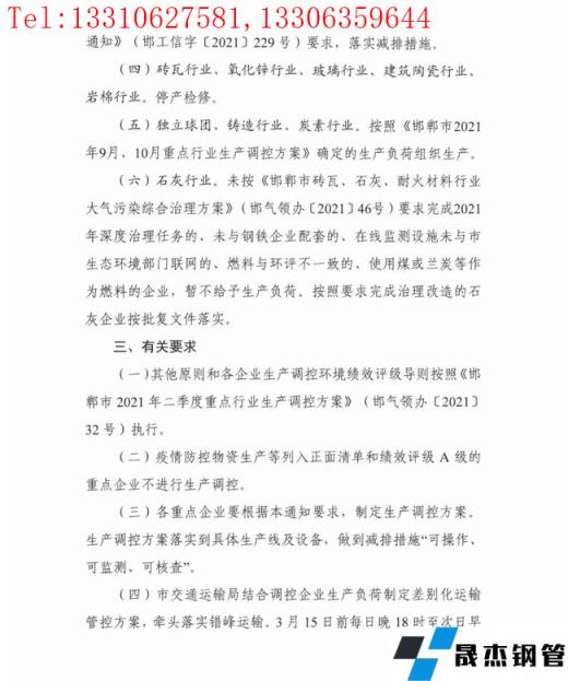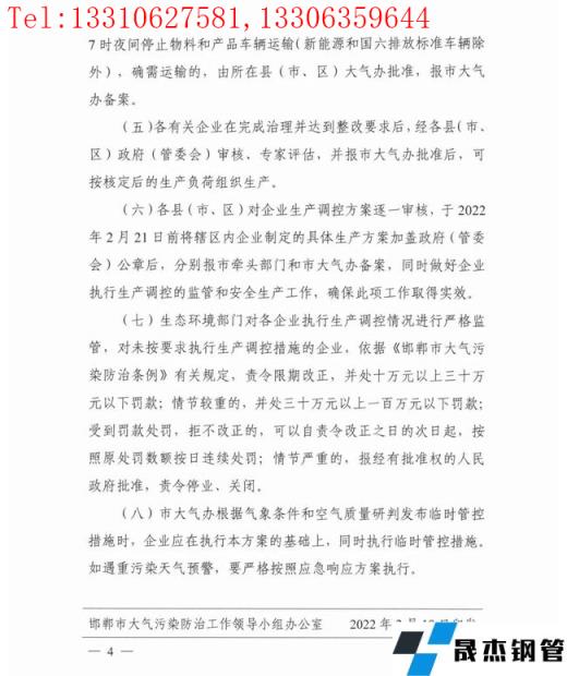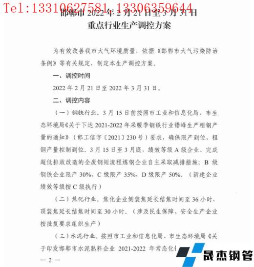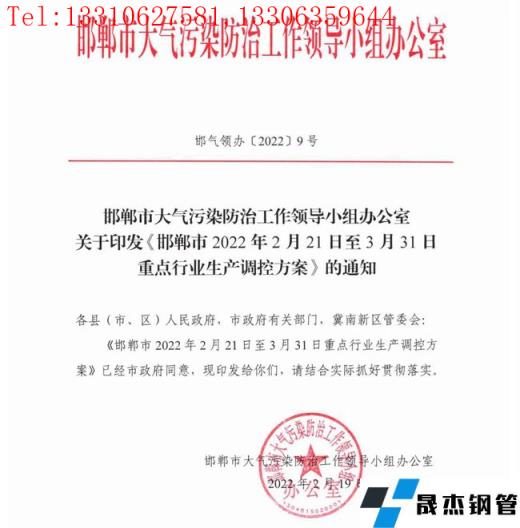日前,邯鄲市大氣汙染防治工作領導小組辦公室印發了《邯鄲市2022年2月21日至3月31日重點行業生產調控方案》。方案中對2022年2月21日至3月31日時段內的鋼鐵、焦化、水泥、獨立球團、鑄造、炭素等重點行業開展停限產措施。