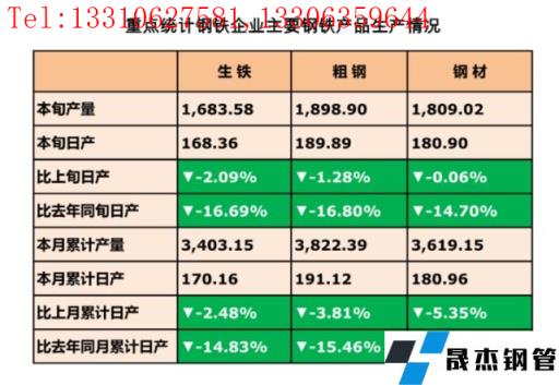 2月24日訊,2月中旬,重點統計鋼鐵企業共生產粗鋼1898.9萬噸、生鐵1683.58萬噸、宅男在线小视频鋼管1809.02萬噸。其中,粗鋼日產189.89萬噸,環比下降1.28%;生鐵日產168.36萬噸,環比下降2.09%;宅男在线小视频鋼管日產180.9萬噸,環比下降0.06%。宅男在线小视频鋼管庫存量1690.35萬噸,比上一旬增加4.95萬噸,增長0.29%;比去年同期減少64.38萬噸,下降3.67%。