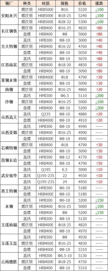 今日宅男视频官网指導價格以漲為主,部分補跌。今日黑色係期貨持續上行,成本大幅上漲,市場心態有所提振,廠家跟漲心態明顯,下遊操作多按需補庫,部分廠商出貨向好,但整體交投一般,預計短期宅男视频官网價格穩中偏強。