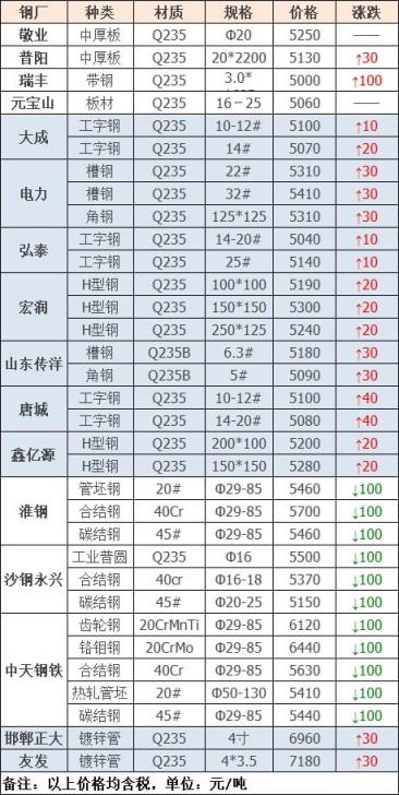 今日板、型、管、特鋼共16家宅男视频官网調價發布,其中: