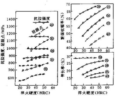 淬火回火工件的熱處理質量通常采用硬度控製,值得注意的是,工件的最終硬度相同並不表明其它力學性能也相同。淬火程度不同的鋼,通過改變回火溫度的方法可以獲得相同的硬度,但其力學性能卻有很大差異。圖2 為淬火程度不同對40Cr鋼拉伸性能的影響。