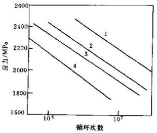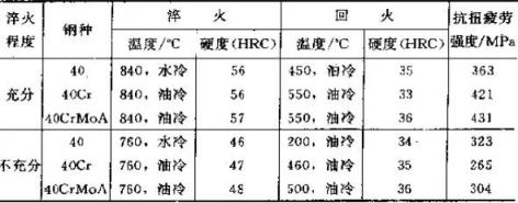 用40鋼、40Cr鋼和40CrMoA鋼加工成兩組疲勞試樣,第一組式樣在840℃正常淬火溫度下加熱淬火,硬度為56~57HRC,第二組用760℃淬火,淬火不充分,淬火硬度隻能達到46~48HRC,將兩組式樣經過不同溫度回火至相同硬度(均為33~36HRC)然後進行疲勞試驗,試驗結果列於表1.實驗表明,淬火不充分的第二組試樣的抗扭疲勞強度比充分淬火的第一組試樣的抗扭疲勞強度低10.8%~37%。