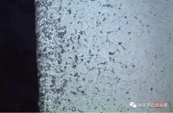 將碳氮共滲中工件的橫截麵拋光後,在未腐蝕或輕微腐蝕的狀態下,使用光學顯微鏡在表麵滲層中有時可觀察到一些分散的大小不一的黑色或暗灰色的斑點、黑帶和黑網,這些深色的斑點、黑帶和黑網,統稱為黑色組織。黑色組織的深度一般不超過0.05mm。深色的斑點是一些主要沿奧氏體晶界分布的大小不一的孔洞。黑色帶通常出現在距表麵0.03mm深度內,黑帶的內測往往可觀察到黑色網,主要由於表層形成了某些合金元素的碳氧化物、氮氧化物和碳化物等小顆粒,使奧氏體中合金元素貧化,導致淬透性降低而形成了托氏體的結果。碳氮共滲的黑色組織類似於氣體滲碳的內氧化,使表麵硬度下降,有益的殘餘壓應力減小,或表麵形成殘餘拉應力,導致疲勞強度的降低。20Cr2Ni4A鋼碳氮共滲試樣表麵黑色組織可使彎曲疲勞強度降低約6%。