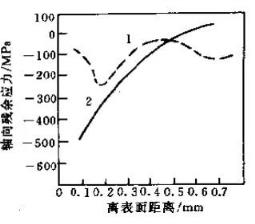 滲碳劑活性太大,滲碳時間過長和滲碳後冷卻速度太慢時,滲層中易形成網狀或大塊狀碳化物,這些碳化物主要是滲碳體和合金滲碳體。碳化物的形成導致其周圍局部合金元素貧化和淬透性下降,淬火後易形成非馬氏體組織。網狀和大塊狀碳化物及非馬氏體組織的形成降低了滲層中有利的殘餘壓應力,見圖3 ,可使滲碳工件的疲勞強度降低25%~30%。