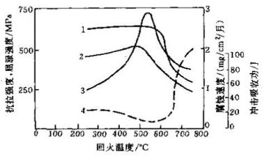 ▲圖5回火溫度對2Cr13性不鏽鋼性能的影響1-抗拉強度2-屈服強度 3-20℃NaCl 3%水溶液中的腐蝕率4-艾氏衝擊韌度