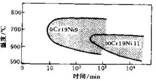 然而在某個特定溫度區間和時間參數下進行熱處理或在某個溫度區間長期使用時,由於含鉻碳化物沿晶界析出將導致晶界腐蝕抗力的急劇下降。表示發生晶界腐蝕的熱處理溫度和時間關係曲線叫做時間-溫度-敏化曲線(T-T-S曲線)。圖6 就是奧氏體不鏽鋼的典型T-T-S曲線。在C型曲線的右側熱處理狀態下,不鏽鋼易產生晶間腐蝕。