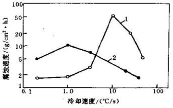 ▲圖7冷卻速度對1Cr17不鏽鋼腐蝕速率的影響1-空冷(從1200℃冷卻) 2-空冷(從950℃冷卻)