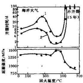 ▲圖10回火溫度對Cr12型不鏽鋼屈服強度和應力腐蝕開裂行為的影響1-外加應力為50%σ0.22-外加應力為75%σ0.2