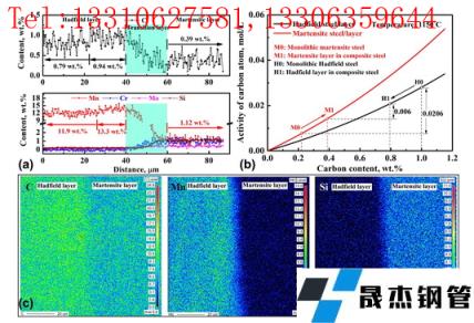 圖 2. EMPA 結果關於相鄰層(a 和 c)之間合金元素的含量以及使用 Thermal Calc 軟件(b)計算的碳活性。
