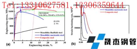 圖 3.複合鋼和參考整體鋼的工程應力-應變曲線 (a) 和相應的應變-硬化速率-應變曲線 (b)。注:UD、TD、UTS 和 YS 分別表示均勻延展性、總延展性、極限抗拉強度和屈服強度。