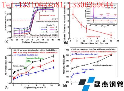 總之,盡管哈德菲爾德層為馬氏體貢獻了 20% 的碳,但仍保留了它的高應變硬化能力。這一點對於本研究中元素擴散策略的成功具有戰略意義。首先,哈德菲爾德層的初始硬化率與整體鋼相當。根據元素分布結果(圖 2(a)),兩層之間存在過渡層(約20μm厚),其厚度根據硬度分布增加到約45μm(圖 4)。該結果表明複合鋼由哈德菲爾德層、馬氏體層和梯度層組成。幾項關於梯度結構的有趣研究表明,在細晶粒和粗晶粒之間的界麵處產生的應力不相容性可能導致應變梯度,這將通過梯度區域中的幾何必要位錯 (GND) 來適應 。