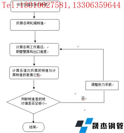 計算方法是:首先根據給定的主輔電機轉速折算出各道次軋輥轉速(公式1),然後設定各道次張力係數。由於孔型尺寸是一定的,所以設定好各道次的張力係數後,根據公式(2,3)可以計算出各道次軋輥的工作直徑和各道次軋後的宅男在线小视频鋼管壁厚。據此,可以計算出各道次宅男在线小视频鋼管的延伸係數和出口速度(公式4),然後再根據出口速度和軋製直徑計算各道次軋輥轉數(公式5)。如果設定的張力係數不合適,那麽,計算出的軋輥轉數與根據主、輔電機轉數折算出的軋輥轉數就會出現差值。此時, 可采用各道次轉數差的絕對值之和作為是否終止計算的依據。如果此數值達到足夠小,便可以終止計算。圖1為用計算機進行道次壁厚計算的框圖。