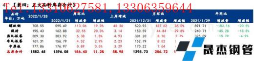 本周五大品種總庫存依然處於累庫趨勢,其中廠庫周環比增2.7%,月環比增3.6%,年同比降30.7%;社庫周環比增14.9%,月環比增27.6%,年同比減3.4%;總庫存周環比增11.2%,月環比增19.8%,年同比減13%。綜合來看,目前庫存累增幅度依舊略低於預期,本周社庫雖然大幅累增近157萬噸,但整體庫存水平依舊低於去年同期水平,主要原因在於2021年大麵積執行能耗雙控,粗鋼及鋼材同比減量,使得入庫資源和市場流入資源大幅減量影響。綜合來看,春節需求停滯,庫存必然延續性累增,加之目前最強雨雪天氣襲來,碼頭、港口、陸路等卸貨均受阻,入庫節奏受限,因此節後增幅大概率比目前更加突出。