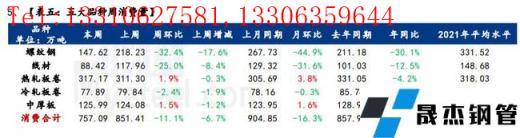 消費方麵,本周五大品種周消費量增至757.09萬噸,環比減少94.32萬噸,降幅11.1%。其中建材環比減少100.15萬噸,降幅29.79%,板材環比增加5.83萬噸,增幅1.13%。