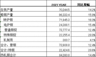 根據日本鋼鐵協會的統計,2021年日本生鐵產量為7034萬噸,同比增長14.2%。粗鋼產出當中,轉爐鋼產量為7194.5萬噸,同比提高16%,電爐鋼產量達2438.8萬噸,同比增長15.4%。
