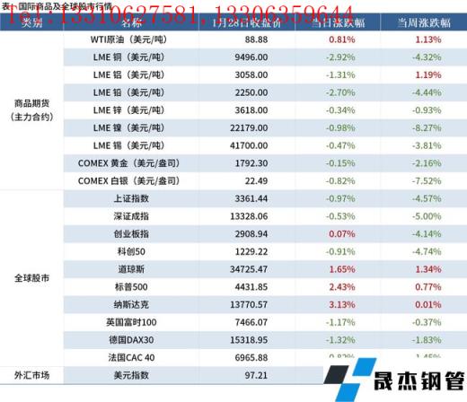 金融市場:本周主要商品期貨品種多下跌,其中黃金大跌8.27%;全球股市中,中歐股市基本下跌,美國股市跌後反彈;美元指數97.21,上漲1.65%。