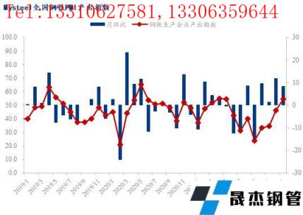 1月份,全國鋼鐵行業無縫宅男在线小视频鋼管廠家產出指數較12月份回升8.4個百分點,終值54.7。具體來看,進入1月份,各地對長流程無縫宅男在线小视频鋼管廠家限產政策明顯放鬆,各地高爐陸續複產,粗鋼產量明顯回升。至後半月,隨著春節假期臨近,短流程無縫宅男在线小视频鋼管廠家陸續放假,無縫宅男在线小视频鋼管廠家產量小幅回落。整體而言,1月份國內鋼鐵產出明顯回升。