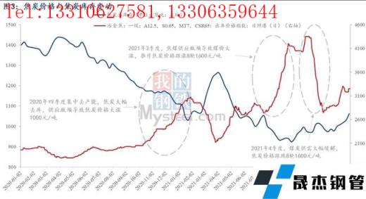 2)而2021年雖沒有再出現2020年4季度集中大幅去產能的情況。但仍出現了2021年三季度焦炭價格大漲1600元/噸的情形,兩個半月漲幅48%,漲幅明顯高於2020年四季度。這主要是由於焦煤供應受限導致的煤價大漲推升焦炭成本大幅上漲,以呂梁低硫主焦煤來看,其價格從6月底至9月底漲了一倍(2050-4100元/噸),焦炭供應矛盾從產能約束轉移至原料供應受限。同樣的,2021年四季度後,國家出台煤炭保供政策,原料供應大幅緩解,同時需求端鐵水產量大減,最終傳導至焦煤價格大跌,焦炭價格應聲回落1600元/噸。