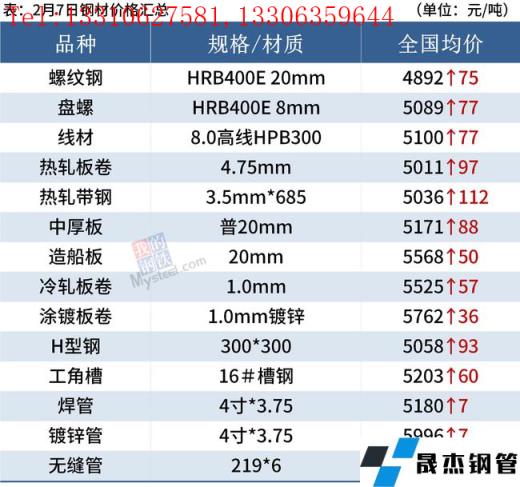 建築宅男在线小视频無縫鋼管:2月7日,全國31個主要城市20mm三級抗震螺紋鋼均價4892元/噸,較節前(1月30日)上漲75元/噸。短期來看,由於需求未真正啟動,現貨市場上漲主要還是情緒麵推動。短期需要關注消費恢複情況,若市場存在高價格低需求,則需謹慎貿易商集中兌現利潤。預計8日國內建築宅男在线小视频無縫鋼管價格或將繼續趨強運行。