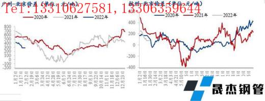 1月份廣州、杭州市場市場價格漲幅緩慢,北京市場價格漲幅居前,因此廣州-北京、杭州-北京市場的區域價差均有所收窄。目前廣州-北京價差在300元/噸左右,此價差略低於2020年、2021年同期水平,且結合無縫宅男在线小视频鋼管廠家的政策以及運費來看此價差也不足以吸引北方區域資源南下廣州。目前杭州-北京價差不足100元/噸,因北京價格相對高位,加之東北區域節後需求啟動較晚,因此東北區域部分無縫宅男在线小视频鋼管廠家傾向於把資源投放至北京區域,其中西林、新撫鋼甚至於海鑫都有此安排。
