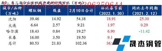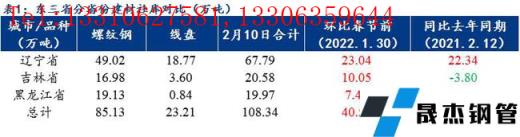 各主流城市分倉庫來看,春節後兩周以來沈陽市場幾大主流倉庫增庫較多;大連市場到貨節奏一般、正常累庫;吉林省內長春兩大主流倉庫現貨庫存也在增加。從無縫宅男在线小视频鋼管廠家產量及庫存來看,本周區域內樣本無縫宅男在线小视频鋼管廠家總產量47.7萬噸,較上周降1.20萬噸;廠庫總量14.19萬噸,與上周變化不大,僅增了0.08萬噸,社庫則大幅度增了40.52萬噸,目前區域內主導無縫宅男在线小视频鋼管廠家生產節奏與節前相比變化不大,不過下遊終端仍未啟動,市場現貨消耗能力有限,社庫繼續大幅度累積,多數商戶表示正月十五後需求或有零星釋放,但真正有效的啟動時間要等到2月底3月初了,因此在無需求的情形下,預估下周東北區域社庫或仍將繼續增加。