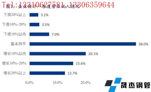 3、對於一季度營業收入的情況,38.0%的企業預計一季度營業收入與去年同期基本持平,48.3%的企業預計一季度營業收入與去年同期相比有所增長,13.6%的企業一季度營業收入同比下降,其中預計一季度營業收入增幅20%以上及降幅20%以上的企業分別占比12.7%和3.1%。