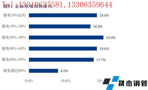 據調研,22.0%的樣本企業明確表示目前存在限電的情況,限電的比例較為平均,35.4%的樣本企業限電比例在20%以內,38.9%的樣本企業限電比例在20%-60%,25.7%的樣本企業限電比例在60%以上。