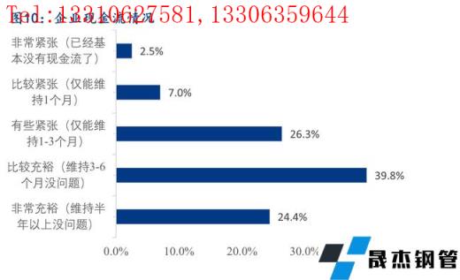 據調研,64.1%的樣本企業資金流是比較或者非常充裕的,26.3%的樣本企業資金有些緊張,僅能維持1-3個月,而資金壓力比較及非常緊張的樣本企業占比9.6%。