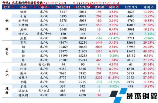 後期來看,鋼價漲勢或放緩,主要在於:1)市場情緒樂觀,庫存壓力小於往年。受1月超預期的社融和信貸數據刺激,市場情緒偏樂觀。而今年春節後的庫存壓力明顯小於往年,市場看漲情緒濃厚。2)下周地產數據公布,或不及預期。在基建的帶動下,1月信貸明顯改善,社融也創單月曆史新高,反映實體經濟融資需求改善。但1月居民中長期貸款增速同比下降,全國13家重點房企銷額同比大幅下滑37%,疊加1月螺紋消費同比下滑24.5%,表明房地產行業需求依然疲弱。下周地產數據公布,數據多半表現較差,或對市場情緒造成負麵影響。此外,當前消費仍然疲弱,價格上漲速度較快,但基本沒有成交。3)成本支撐或減弱。華北環保限產加嚴,且2月是鋼企主動去原料庫存階段,原料需求偏弱,疊加發改委對鐵礦石和煤炭價格過快上漲監管力度加嚴,宅男在线小视频無縫鋼管成本有下跌風險,或拖累鋼價。