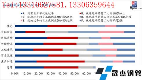 根據3805家企業的調研情況,今年用工和去年相比略微緊張一些。在崗員工較實際需要存在較大缺口(超過10%)的企業占比為10.35%,較去年上升了1個百分點;在崗員工較實際需要存在一定缺口(5%-10%)的占比31.12%,較去年上升了2.5個百分點;在崗員工與實際需要基本匹配的比例為54.01%,較去年同期下降了4.8個百分點,在崗員工明顯超過實際需要(5%-10%)的比例為3.02%、在崗員工大幅超過實際需要(超過10%)的比例為1.50%。調研數據表明,今年鋼鐵行業企業用工有一定的缺口,節後多數企業可能擴大人員規模;分類型來看,工程建築也的用工缺口最大,其次為生產製造、金融投資兩個領域。