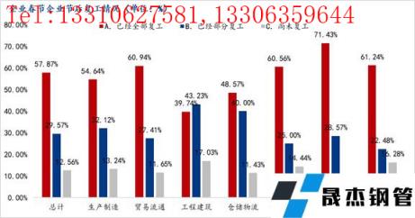 本次調研的3805家鋼鐵企業中,已全部複工企業2202家,已經部分複工企業1125,尚未複工企業478,占比分別為57.87%、29.57%、12.56%。同期相比,已經複工企業較去年降低了8個百分點,尚未複工企業比例增加1個百分點,部分複工企業占比上升較為明顯。